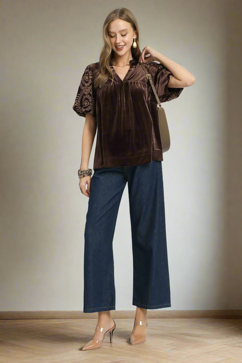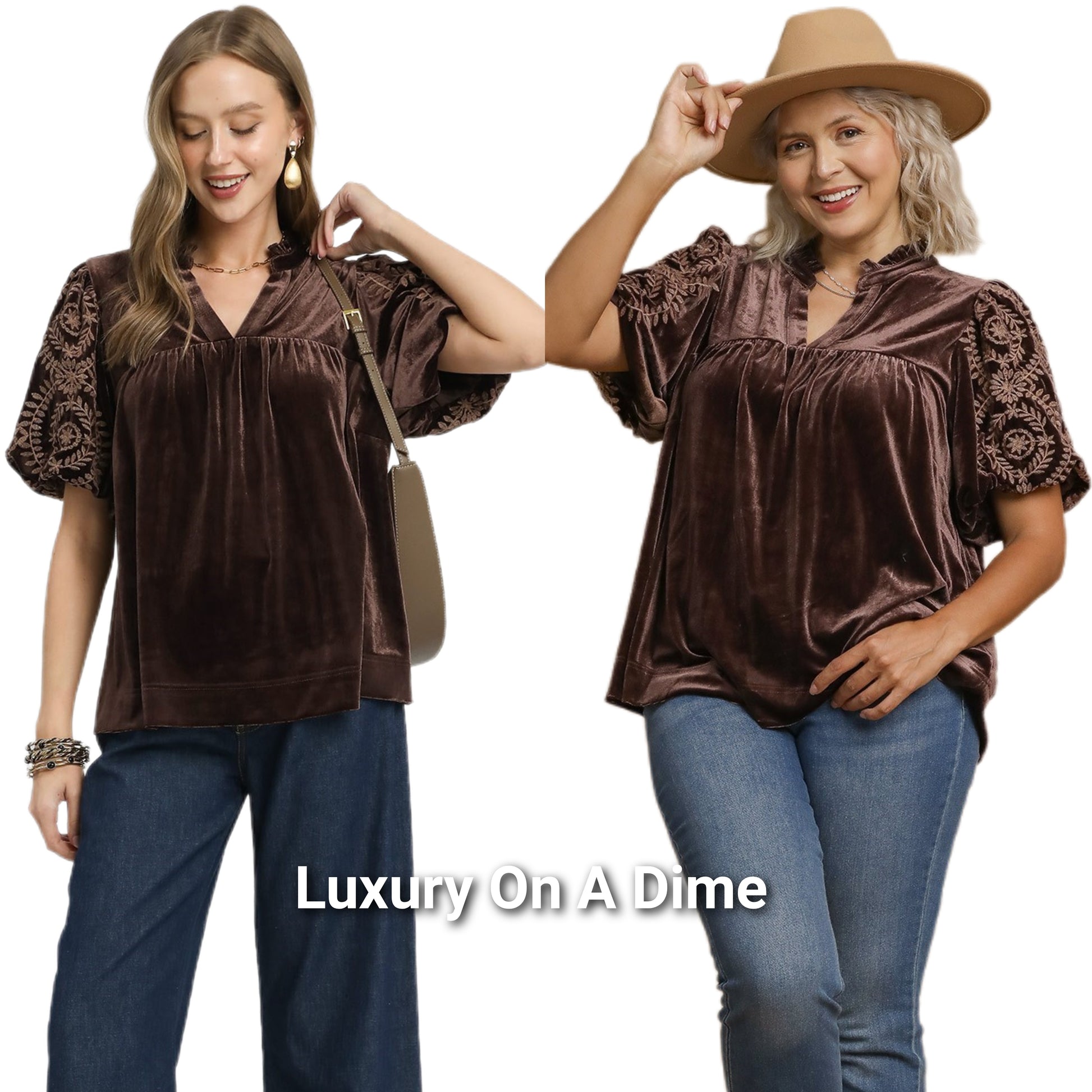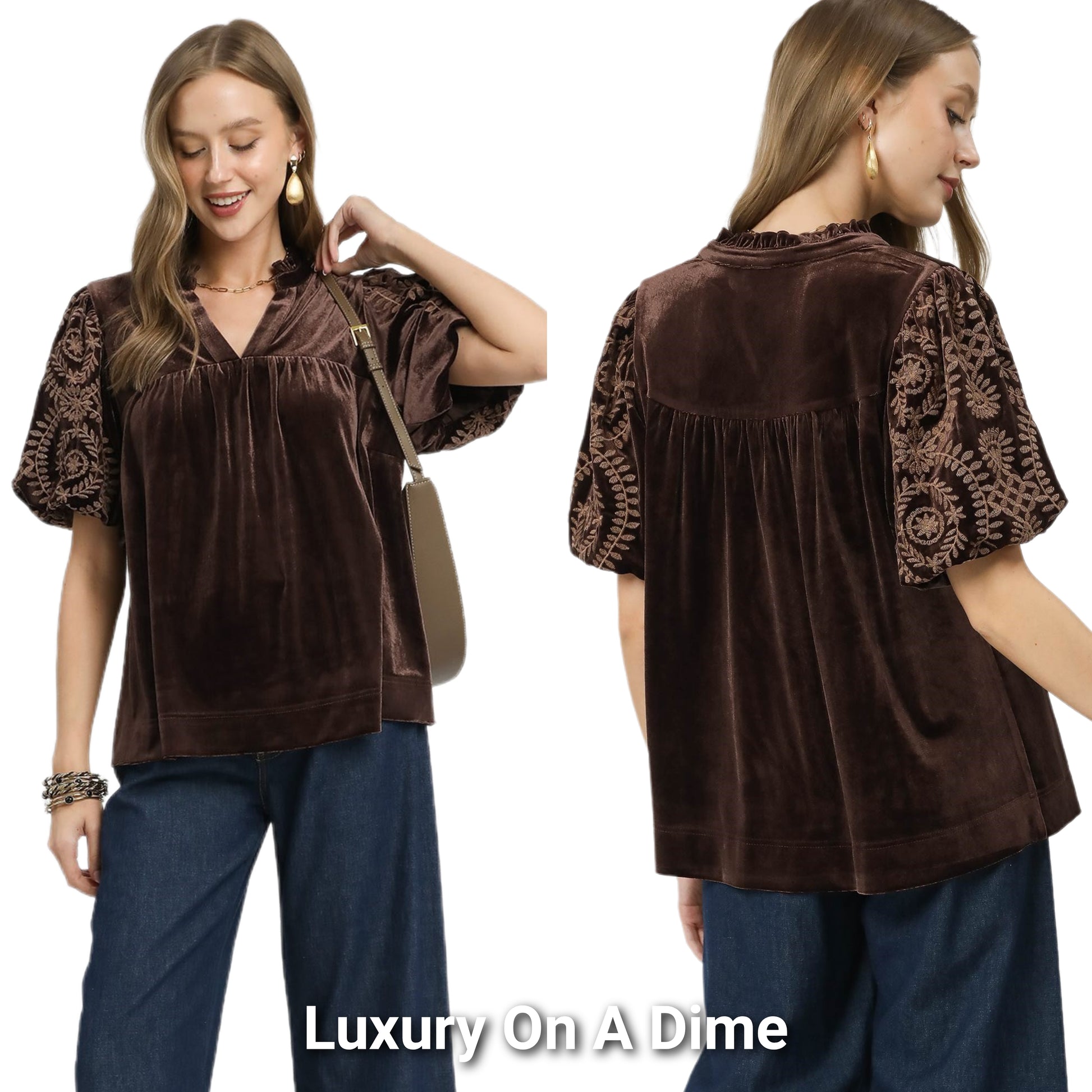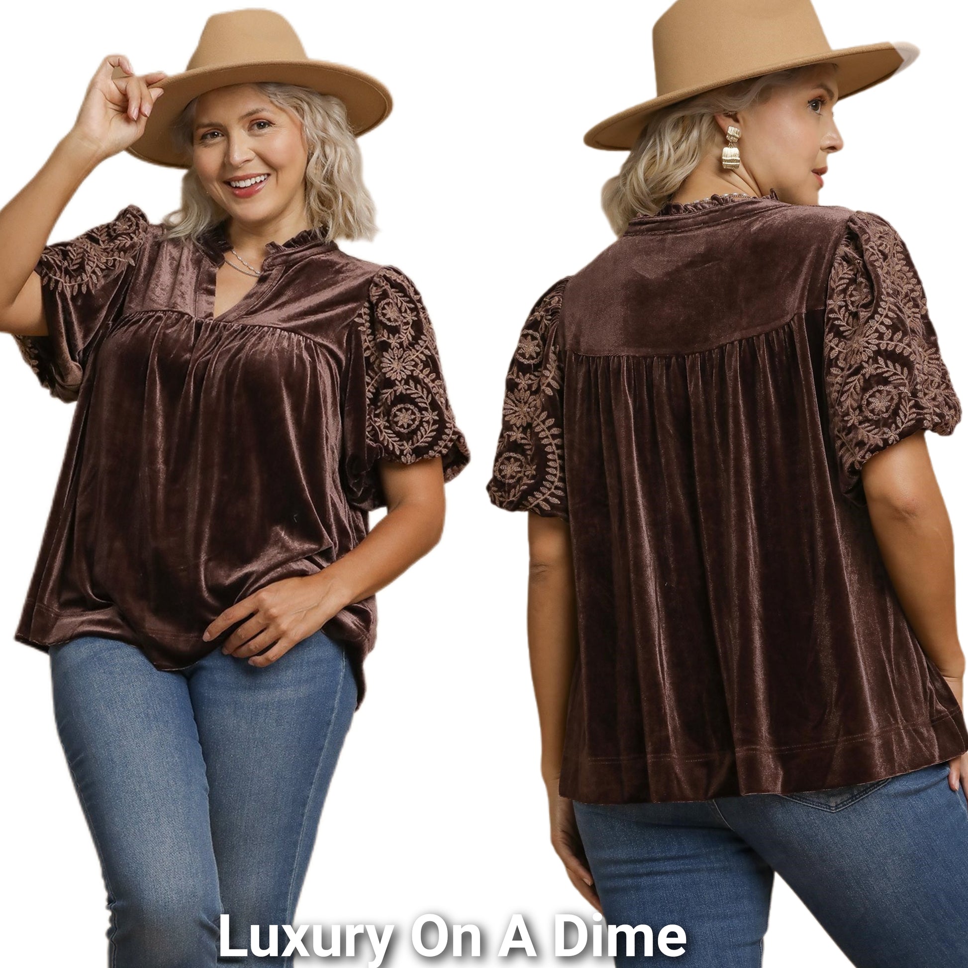 Umgee Velvet Embroidered Floral 70s Retro Babydoll Shirt Top Blouson Sleeve Blouse Plus Size Available