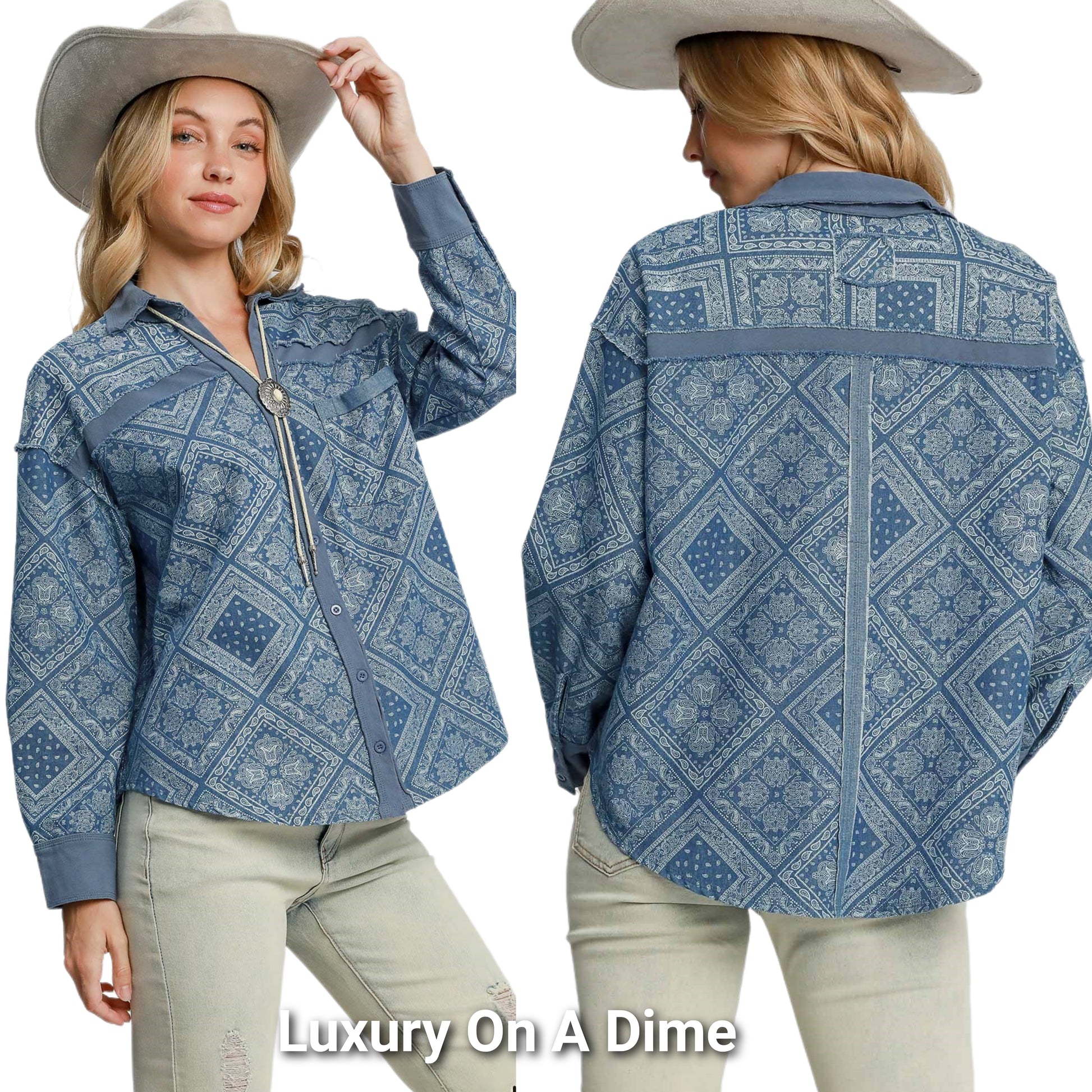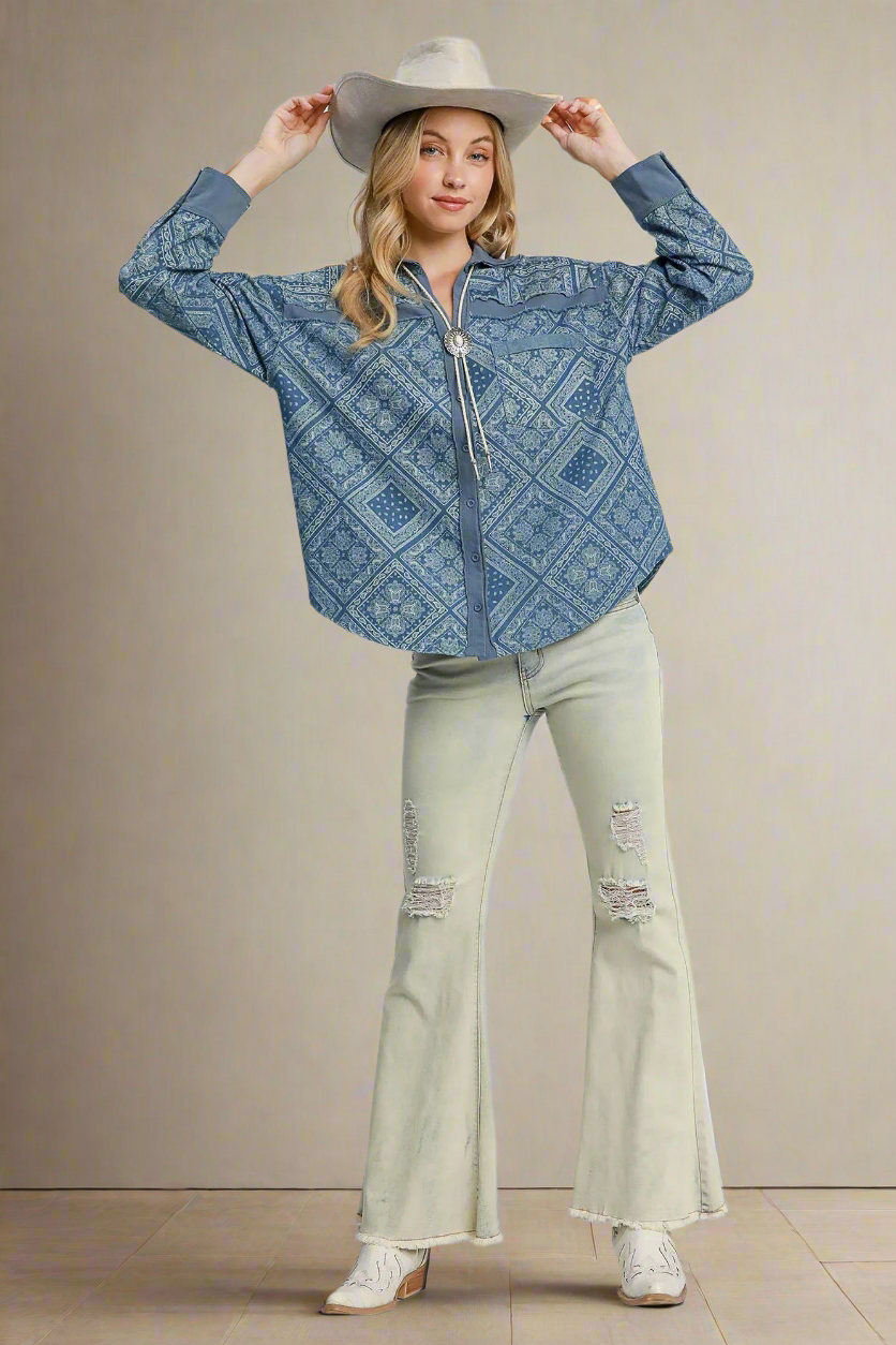 Umgee Denim Shacket Raw Seam Retro Paisley Boho Jean Button Dress Shirt Jacket