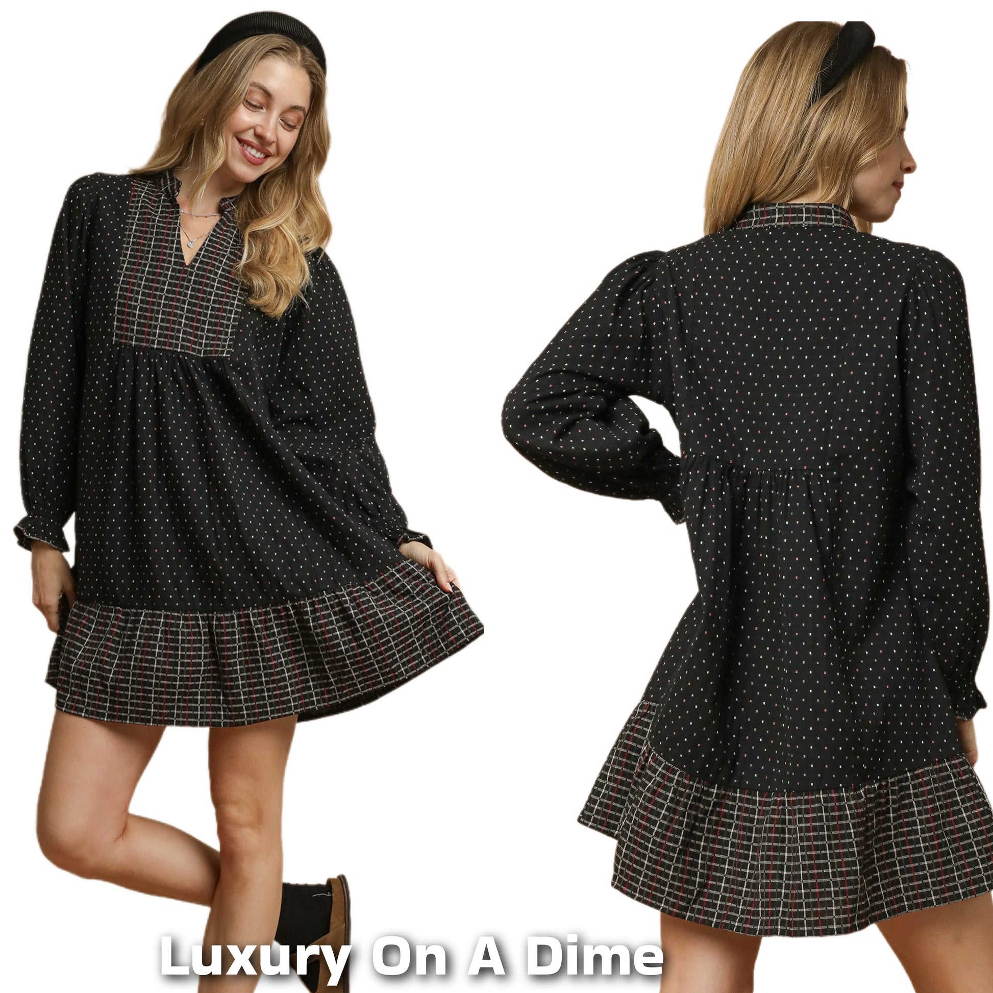 Umgee 90s Retro Boho Babydoll Polka Dot Plaid Contrasting Oversized Mini Linen Dress