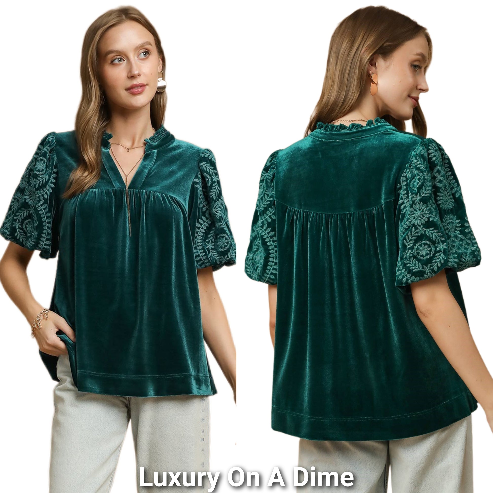 Umgee Velvet Embroidered Floral 70s Retro Babydoll Shirt Top Blouson Sleeve Blouse Green