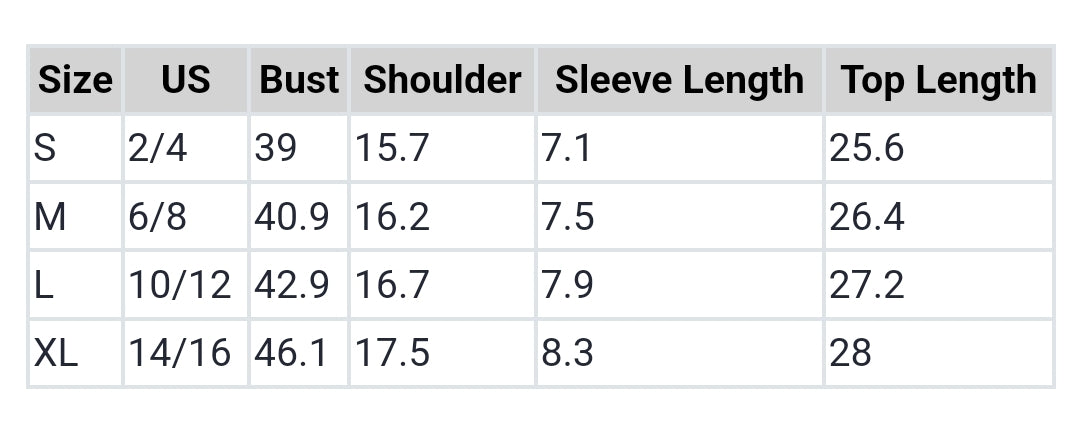 | Size | US | Bust | Shoulder | Sleeve Length | Top Length |