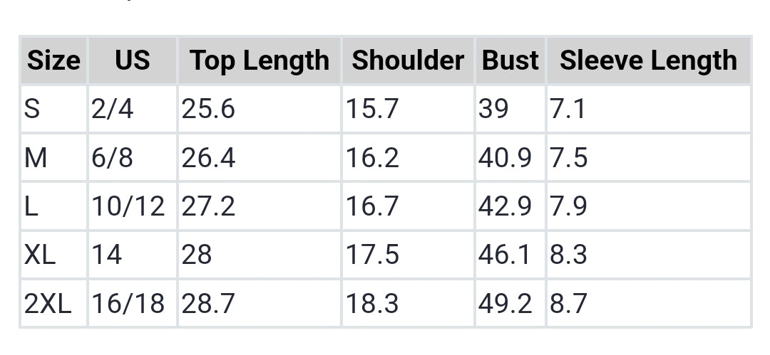 | Size | US | Top Length | Shoulder | Bust | Sleeve Length |