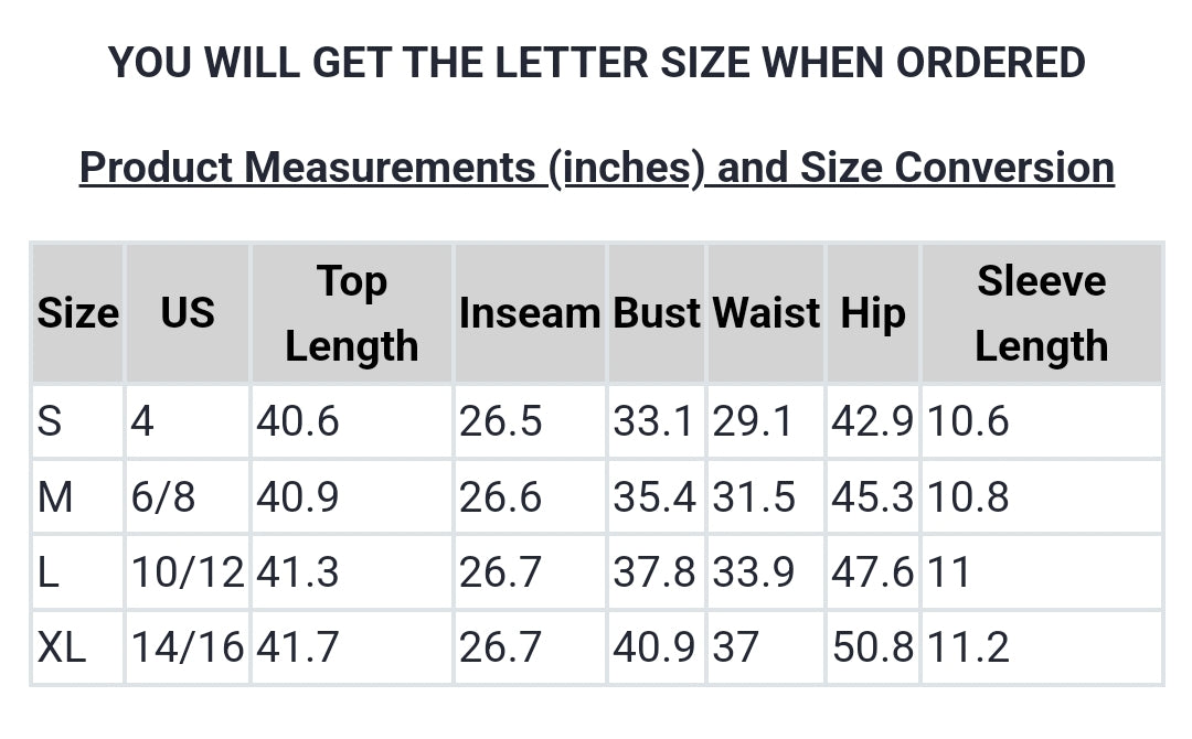 | Size | US | Top Length | Inseam | Bust | Waist | Hip | Sleeve Length |