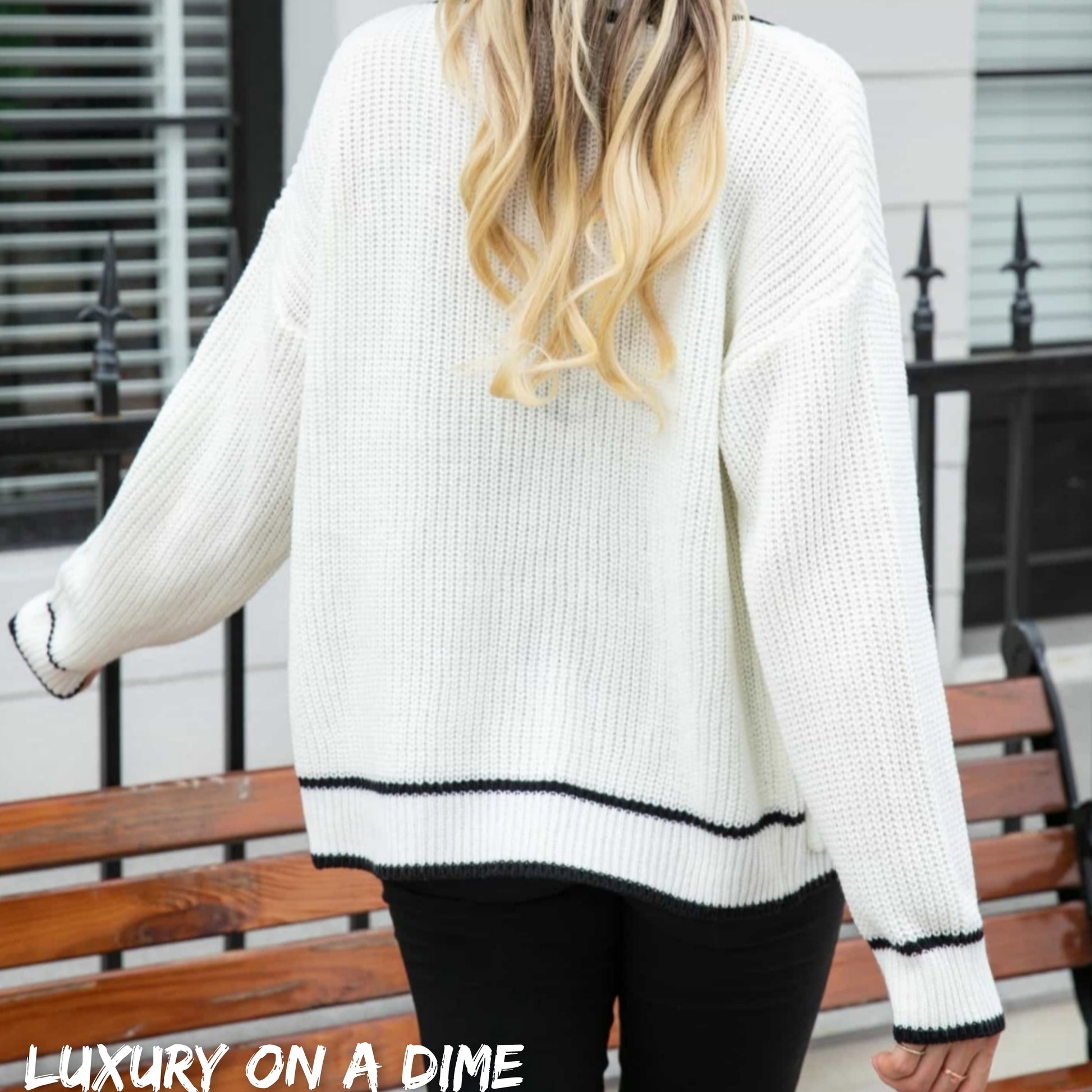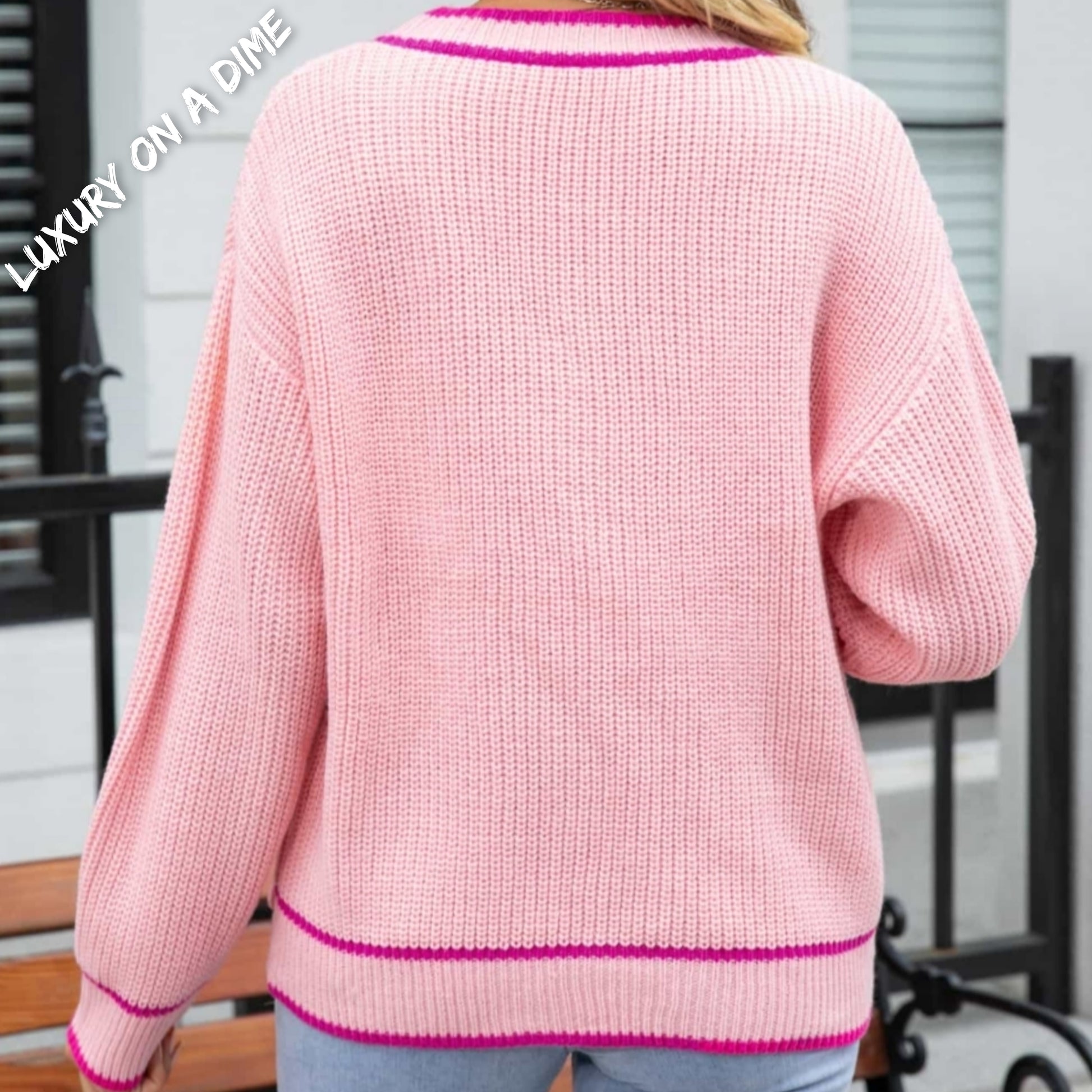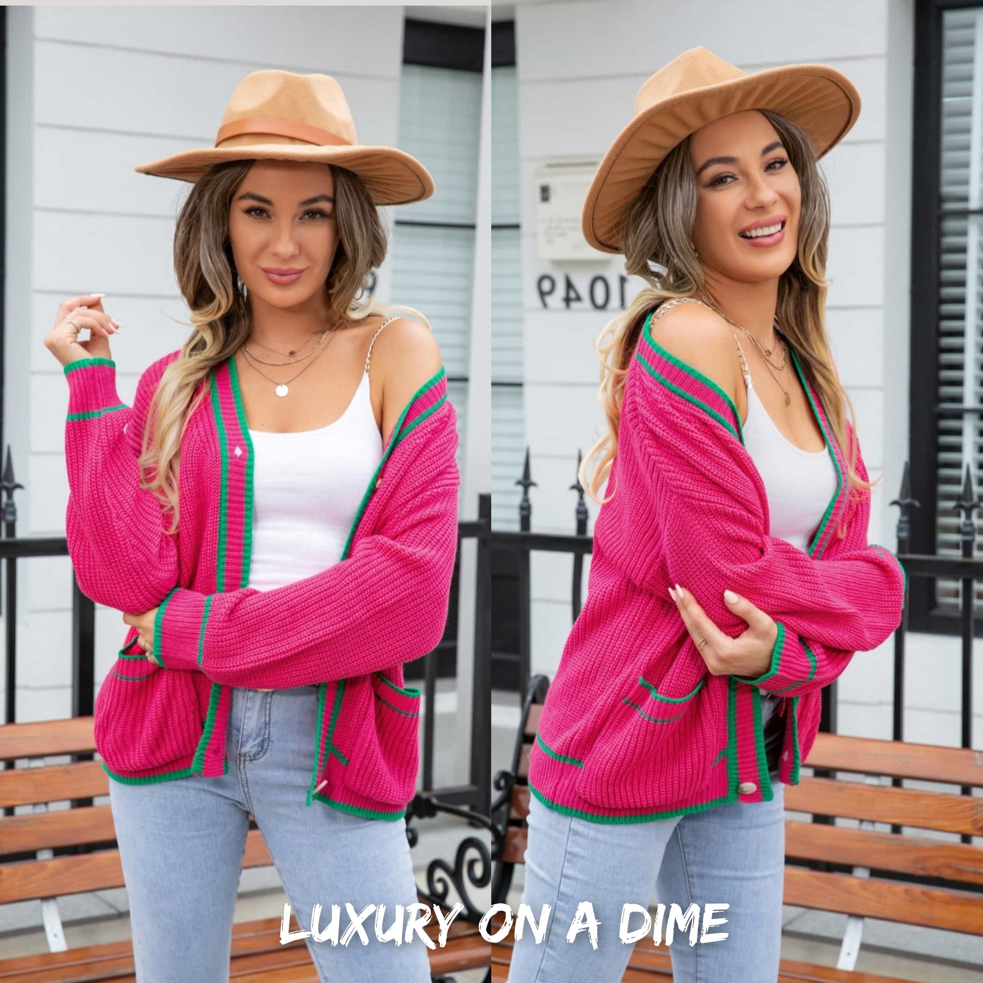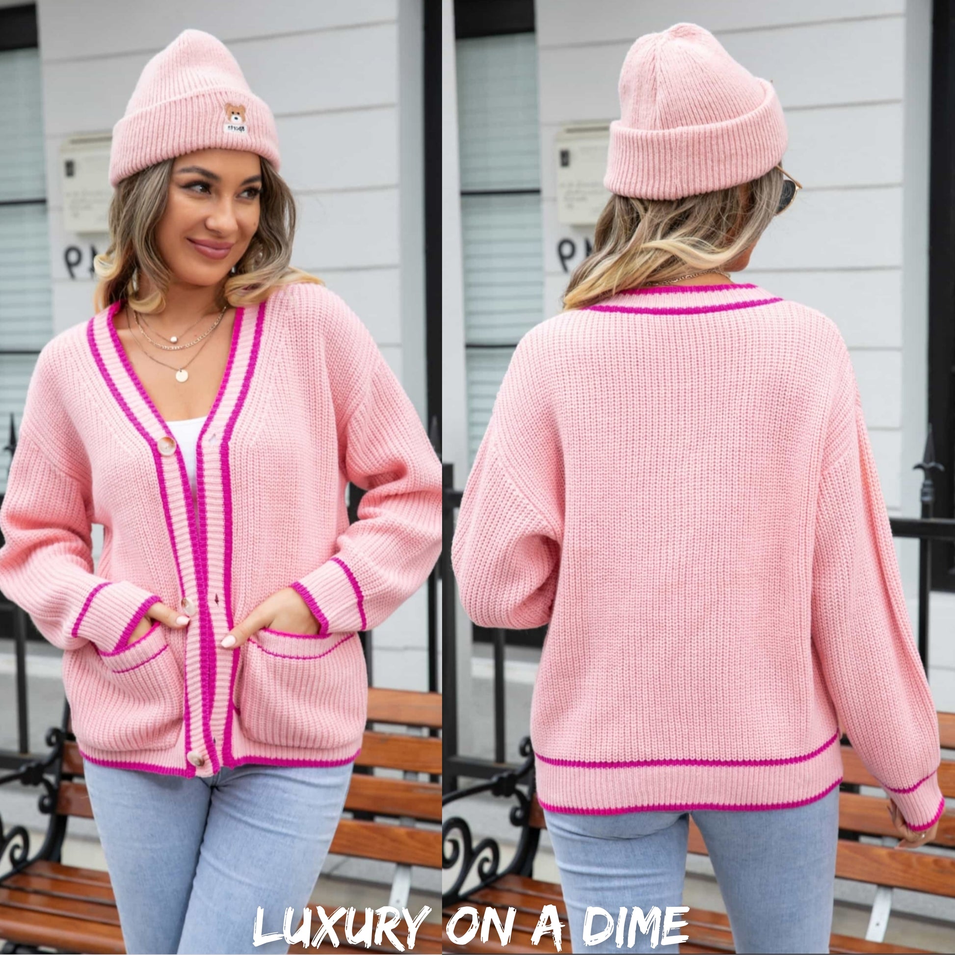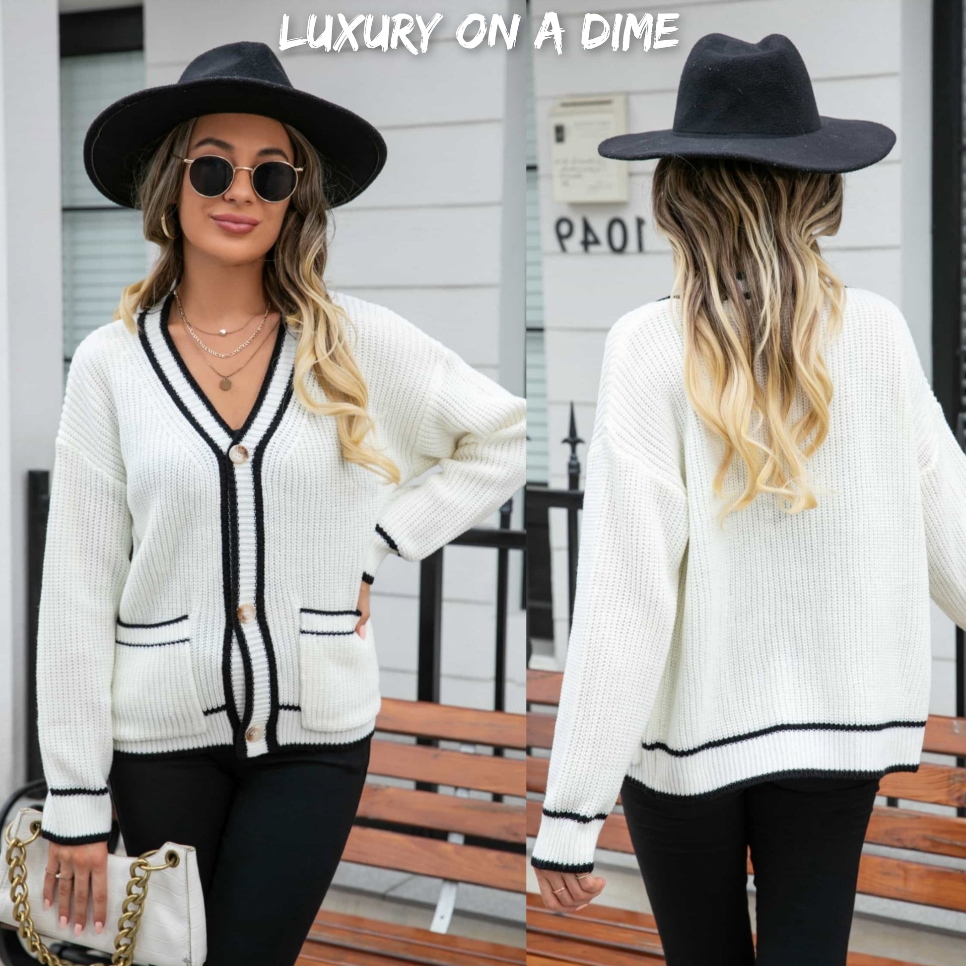 Contrast Waffle Knit Button Front Sweater Cardigan with Pockets