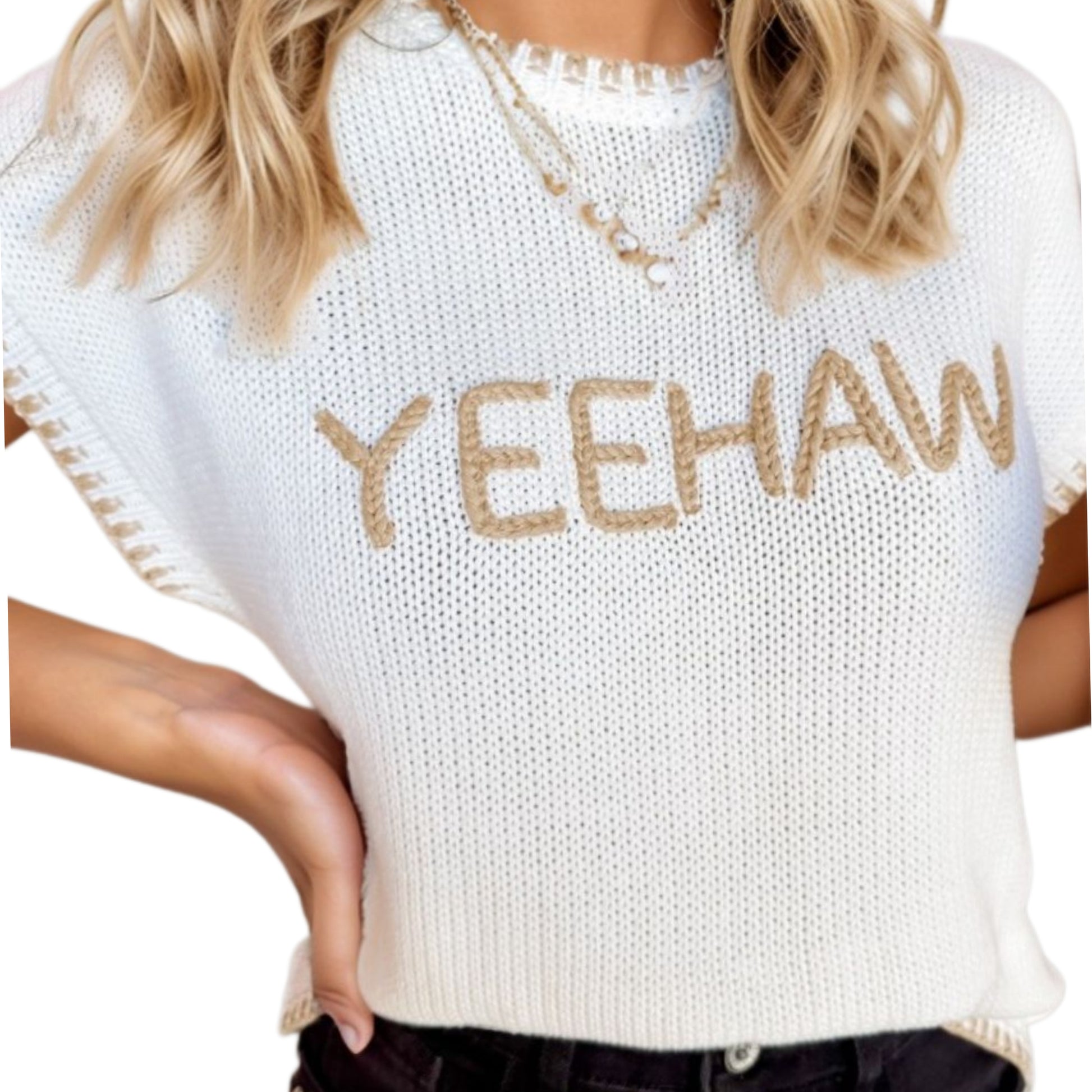 This playful knit top blends playful western charm with handcrafted softness, creating a statement piece that feels both nostalgic and easy to wear. Designed with a classic crew neckline, it features a breathable knit body that drapes comfortably for everyday preppy styling. The standout detail is the contrasting stitch edge finish along the neckline, sleeves, and hem, adding subtle texture and visual interest while highlighting the garment’s handmade inspired character. The stitched “YEEHAW” lettering across the front reinforces its country western influence, offering a lighthearted, expressive touch without overpowering the design. Lightweight and versatile, this top layers effortlessly or stands alone as a casual statement, making it ideal for relaxed, creative wardrobes. Rooted in grannycore sensibility with a country twist, it celebrates cozy craftsmanship, rural nostalgia, and playful self expression.